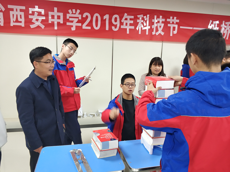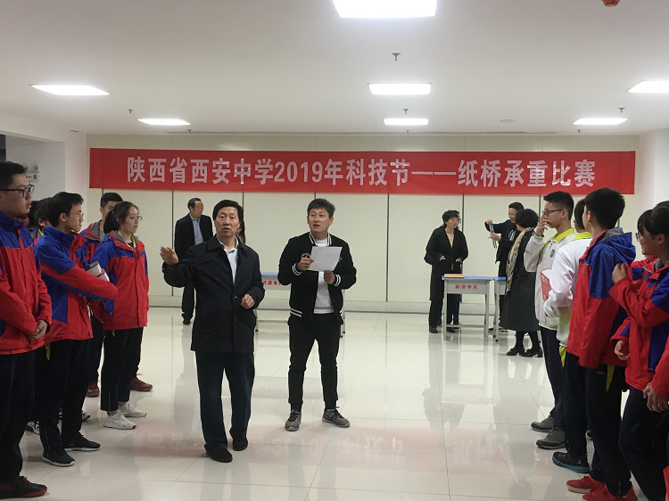 2019年10月24日下午,由陕西省西安中学举办的科技节其中一个环节“纸桥承重比赛”在体育馆举行。此次活动由蒲强老师带领高二物理组全体老师组织参与,张旭日老师、杨毅老师、马晓勇老师等担任裁判。