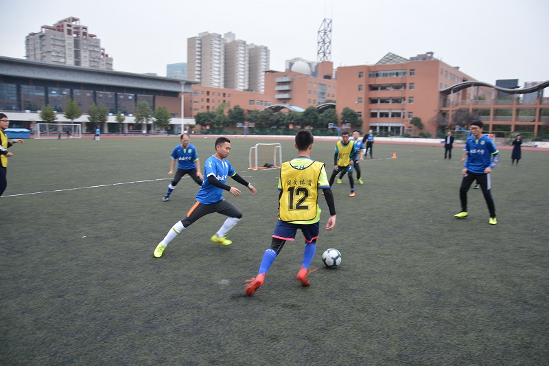 王燕主席、郑宏宝主任、刘卫主任亲临现场为两队球员加油助威!刘卫主任主持了开场仪式并为本场比赛开球。两队球员你来我往热情高涨,学生联队展示出了技术娴熟的特点,开场不久便实现了两球领先的优势。随着比赛的深入,教工队冷静及配合娴熟的优势得到发挥,将比分追至了2:2,上半场结束时,教工对与学生联队的比分锁定在了3:2。
