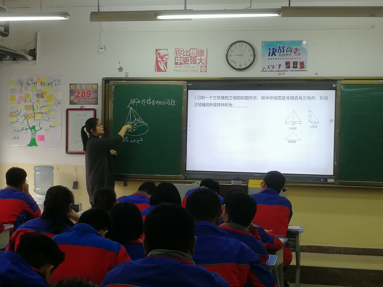 上午第一节和第五节,高三数学组范欣老师进行了组内公开课展示,课题为《与球有关的接、切问题》。本节课是高三第一轮复习第八章第二节《简单几何体的表面积和体积》第2课时的内容,,以高考出题频率较高的多面体外接球和内切球的问题为主要讨论点,通过由浅入深的习题设计,总结归纳出解决多面体外接球和内切球的一般方法和解题注意点,在巩固基础和提升能力方面为同学们做了示范。整个课堂学生参与度高,积极思考并回答问题,在范欣老师的有效引导下学到了方法,提升了能力。