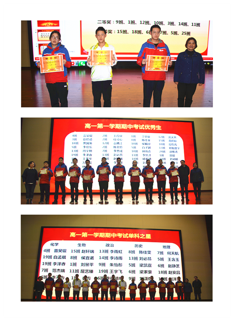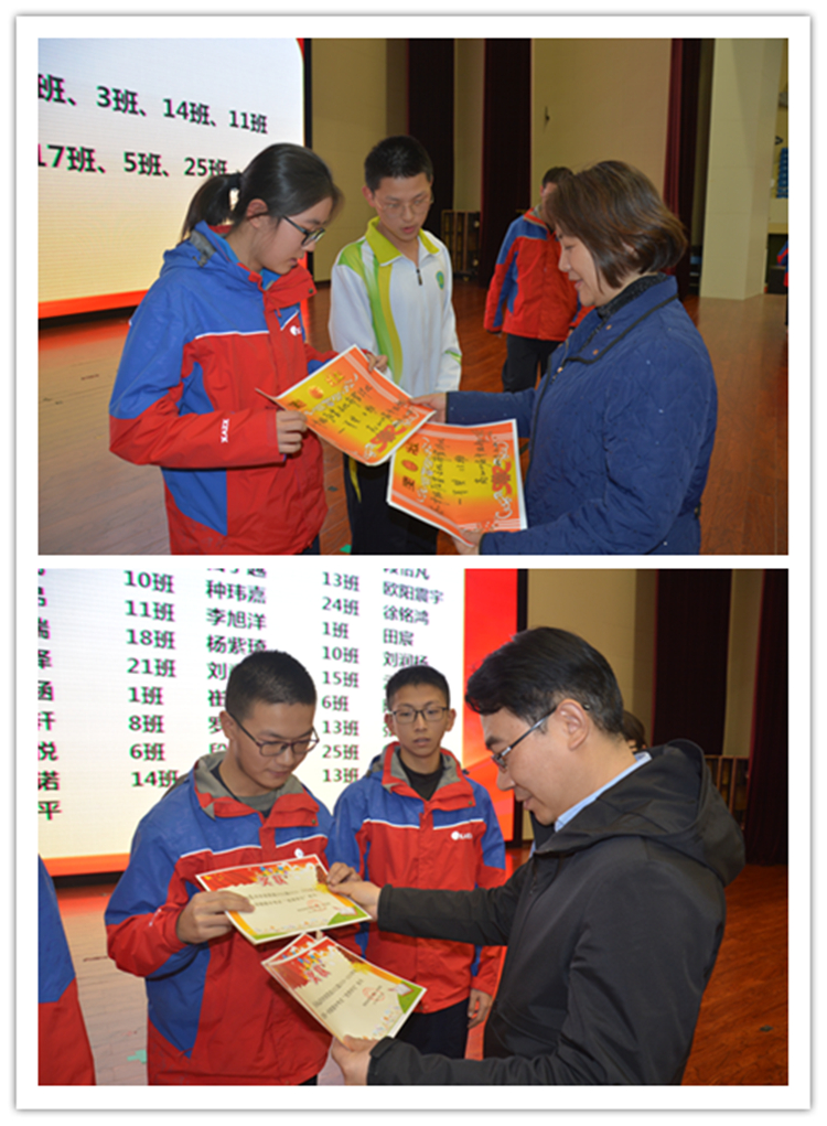 随后饶主任宣布了期中表彰决定,共64名学生和3个班级代表上台接受学校表彰,他们或是期中考试成绩优异,或是在各项活动中发挥出色,年级希望他们继续发奋图强,带动其他同学一起前进。
