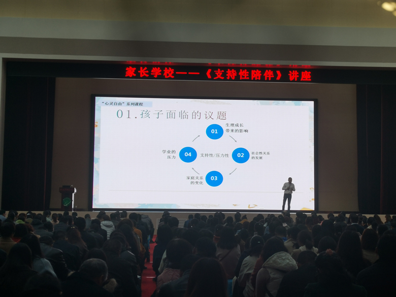在我校学生处精心组织安排下,2019年11月15日,我校家长学校活动圆满举办。此次活动请来了国家二级心理咨询师、陕西省心理卫生协会会员、青少年团体心理治疗师杨帆老师为我校高一高二全体家长开展了题为《支持性陪伴》的专题讲座。