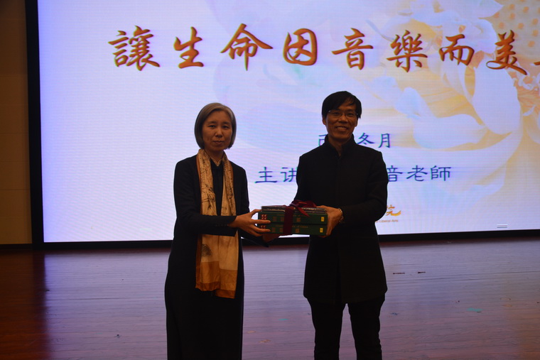 讲座正式开始之前,德音老师代表允中文教院向母校捐赠了三部国乐作品,分别是《国乐启蒙》《望月》和《鹤鸣九皋》,薛党鹏校长代表学校接受了捐赠,并发表讲话。薛校长表示希望西中学子通过讲座能够更加热爱中华文化、更加了解中华文化,并祝福允中文教院在传承中华文化方面越走越远、越走越好。