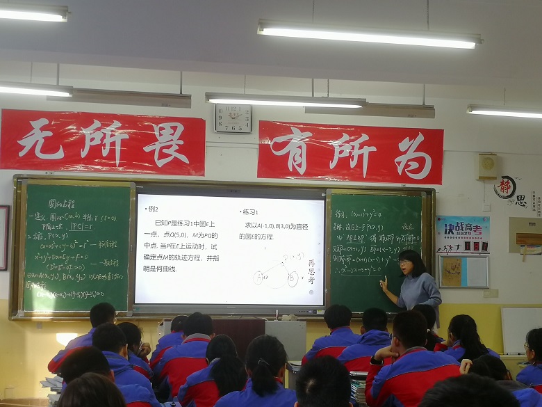 罗欣老师先通过圆的定义,方程的回顾开启本节课的内容。整节课选择了三个典型题型,涉及不同方式求解圆的方程、从圆的几何性质探索与圆有关的轨迹问题。让学生从简单问题中巩固了圆方程中的求解思路与计算方法。整节课设计紧凑,学生训练讨论的当,收获较好。课后备课组也集体讨论了本节的亮点,对学情了解准确,不失为一节优秀的高三复习备考课程。