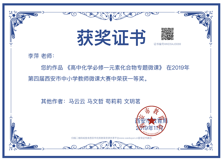 本次大赛由西安市教育科学研究所专家、教研员担任评委,按学科、学段组成评审小组,依据公平、公正、公开的原则,在全市评选出学科系列微课程一等奖12件。我校化学组李萍老师及其微课团队的马云云、马文哲、苟莉莉、文玥茗老师的学科系列微课程《高中化学必修一元素化合物专题微课》获得学科系列微课程一等奖,并在活动现场进行颁奖表彰。苟莉莉老师的个人微课《化学反应条件的控制——解读硫酸工业》获得单节微课一等奖。
