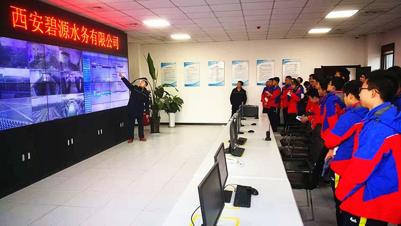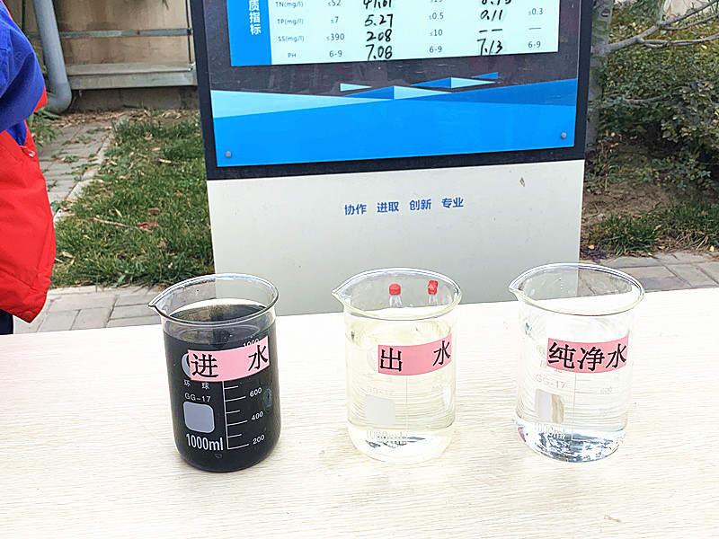 工作人员一边讲解污水处理的工艺和流程,一边介绍科普知识。他说:“城市污水经过专门的管道进入处理厂后,经过拦截大块垃圾、浓缩池、生物池、MBR膜池、二沉池、消毒池等近十个处理步骤,最终达到一级A标准,作为西安湖、渭河湿地以及渭河生态林水系补水使用。”在最终的排口处,操作台上摆着三个烧杯,一个装满处理前的黑色污水,一个盛着处理后的中水,另一个盛满纯净水。经过处理的水清澈透明,几乎看不到明显的杂质和颜色,与纯净水十分接近,同学们纷纷驻足讨论。