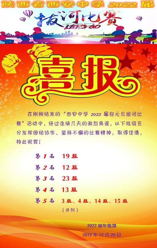 12月19日,经过三天的激烈角逐,高2022届“迎元旦”拔河比赛圆满落下帷幕,高一19班最终赢得了比赛冠军。