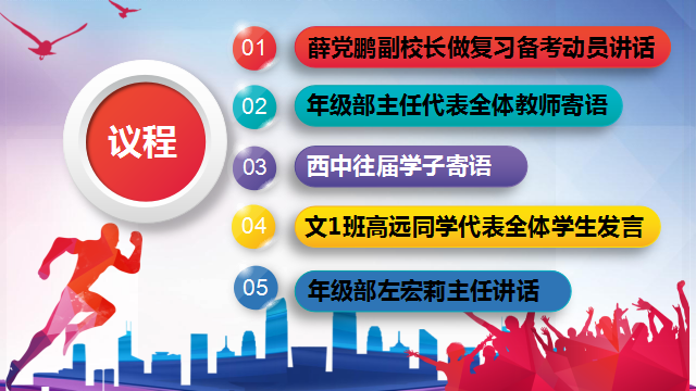 激励大会由高2020届年级部左宏莉主任主持,会议共有五项议程:薛党鹏副校长做复习备考动员讲话、年级部主任代表全体教师寄语、西中往届学子寄语、文1班高远同学代表全体学生发言、年级部左宏莉主任讲话。