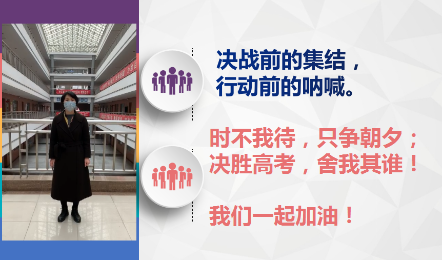 高三年级部左宏莉主任、吕铎副主任和付斌副主任专程来到校园录下视频,代表全体高三教师寄语同学们,希望同学们在这100天里,要有饱满的热情、高昂的斗志、刻苦的精神、坚韧的毅力,并表示老师们一定会和同学们风雨同舟,并肩战斗,同甘共苦,携手前行!