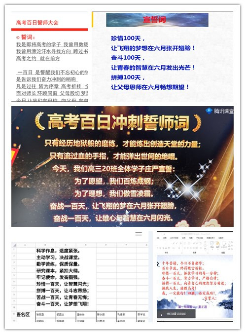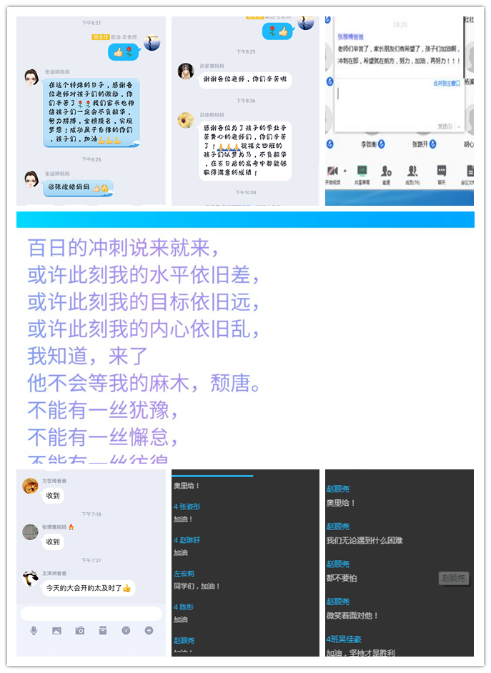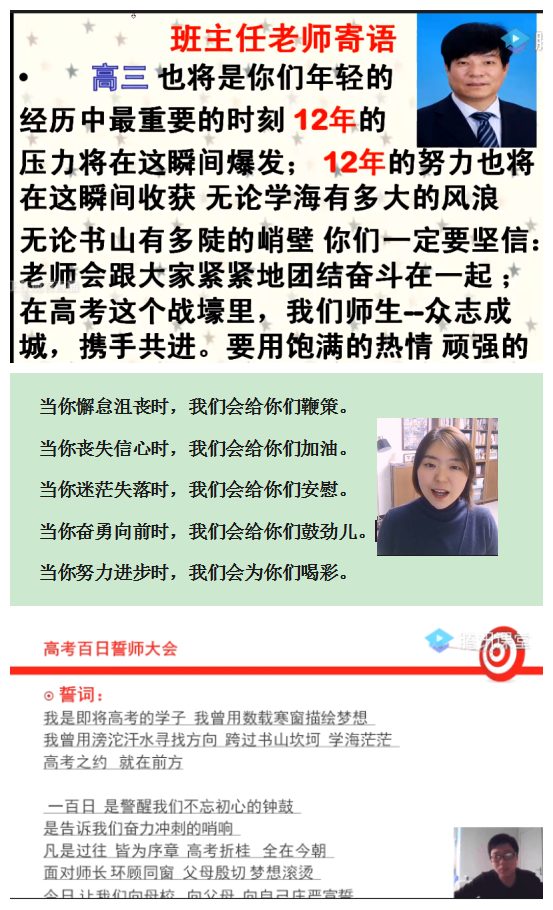 学校激励大会统一议程结束后,各班在班主任的主持下开展了各具特色的班级激励活动。在班级激励大会上,各位班主任都或语重心长或慷慨激昂地寄语学生,为他们的高考冲刺鼓劲加油;同学们也一一通过视频表达了自己的高考誓言,相互激励;各位任课教师和家长也分别通过视频等方式为同学们呐喊助威;各班还分别举行了不同形式的网上集体宣誓活动。有的班级还制作视频回顾高中生活的点点滴滴,有的还利用网络平台线上签名誓师,……全年级各班的激励活动内容丰富,精彩纷呈。