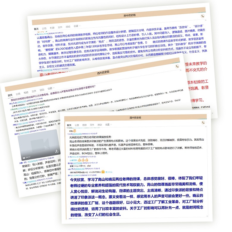 虽然高一高二复课在即,校园团聚指日可待,但是教学不止眼前的网课直播和线下教学,还有信息化教学技能多元化的远方田野。4月15日,历史组再次线上相逢,结合历史组选送参加我校“我最喜欢的微课” 评选活动的常晓云、高山两位老师的微课作品,开展“在线观摩和研讨微课教学”主题活动。由于三个年级的教学时间有所差异,本次教研活动采用了“自主观看,线上研讨”的方式,历史组全局动员、全员参与,刘文芳、南向红、王理、常晓云、李文安、高山、郭蕾、李静、左鑫、李帅共十位教师积极参与其中,各抒己见,畅所欲言,从微课的内容设计、制作方法、注意事项等方面进行了深入探讨。各位老师一致认为:两位老师的微课作品整体设计新颖、逻辑层次分明、内容详实丰富、是两节具有“历史味”、“设计感”的“时尚课”,体现了历史组老师过硬的专业素养和超强的现代技术驾驭能力,也充分展现了历史学科广博多元的魅力。