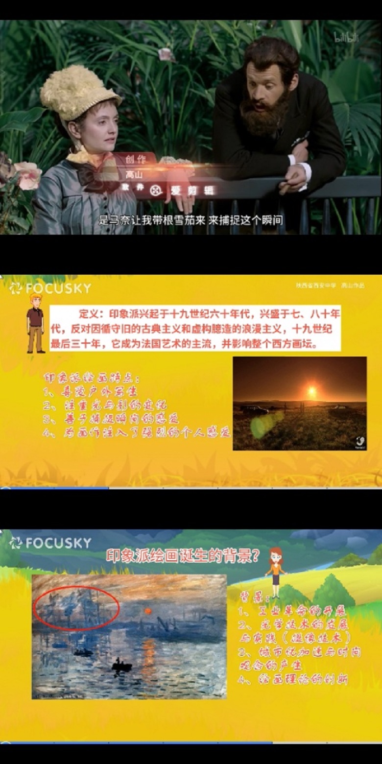高山老师的《去美术馆看不懂印象派》集现代性、艺术性、科技性于一体,视觉冲击力强,图文并茂,彰显未来教学的跨学科综合性特点,将美学、文学、史学相恰到好处的结合但又不失历史学学科特征,巧妙而不突兀的介绍印象派产生的背景,以及经济科技对艺术的影响,既有故事性趣味性又有逻辑性。