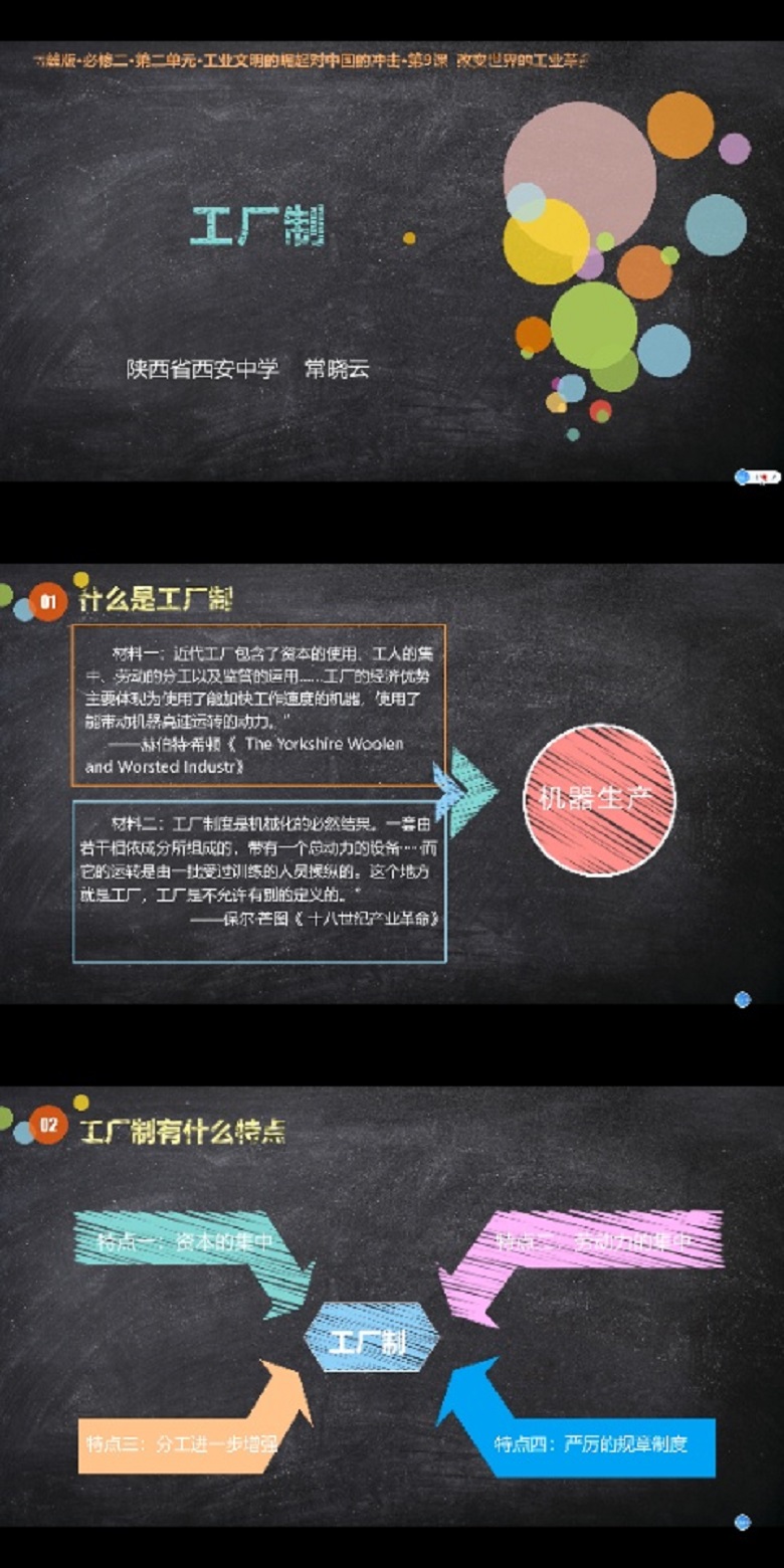常晓云老师的《工厂制》建立在丰富翔实的史料构建的历史探究情境之中,选取真实可靠的史料,在不设立场前提下,带领学生进行客观分析。教学语言富有亲和力、娓娓道来,教学过程形象生动,启发式教学运用娴熟,教学氛围的营造有利于提升学生学习的积极主动性。