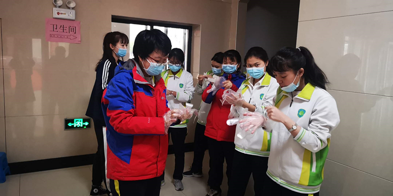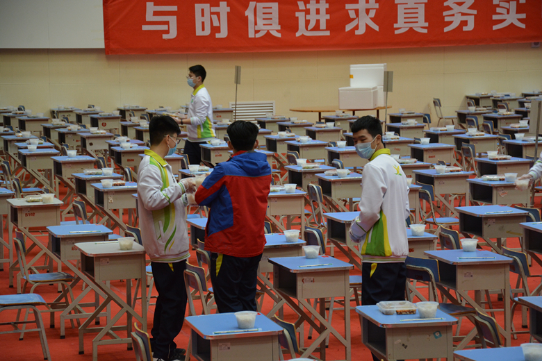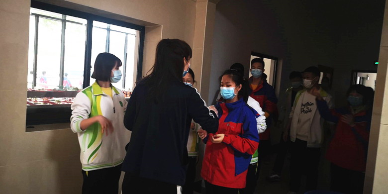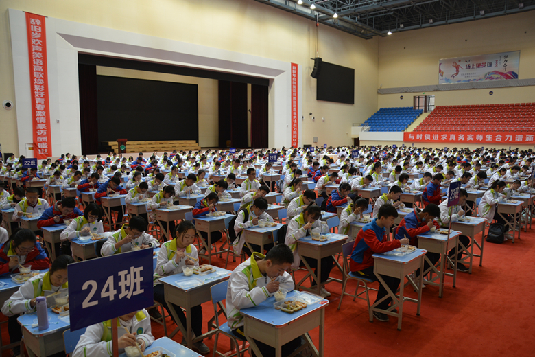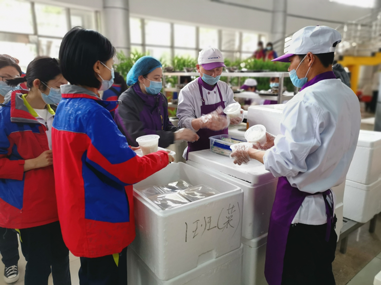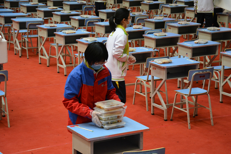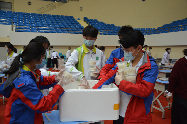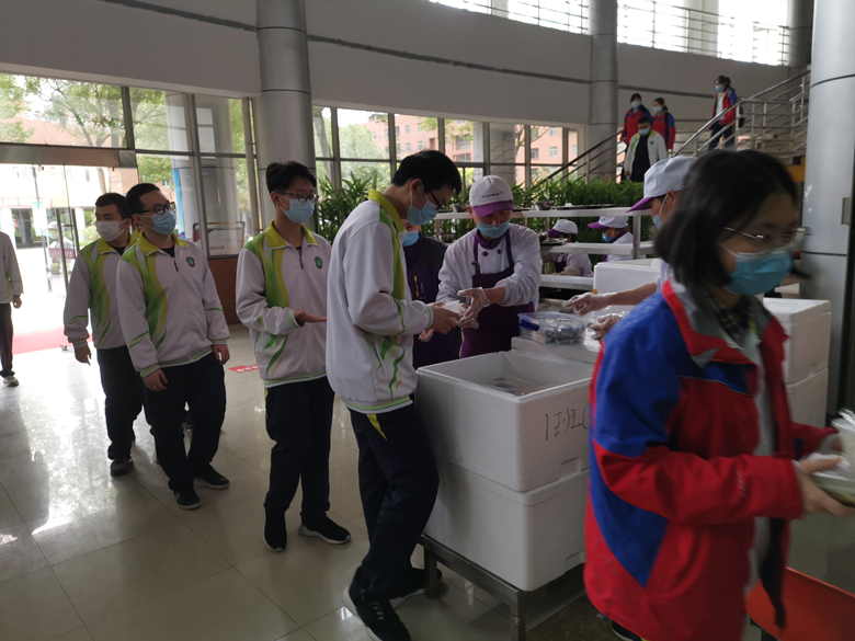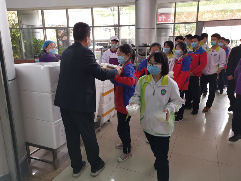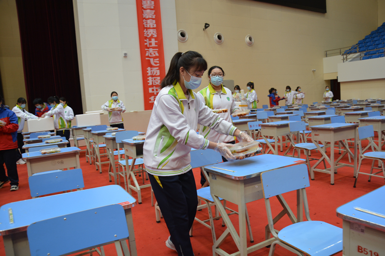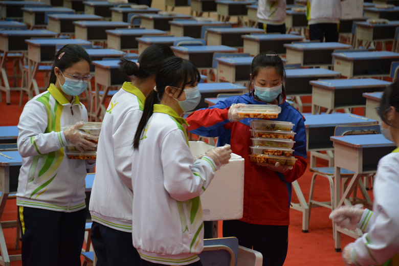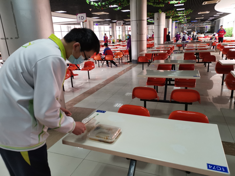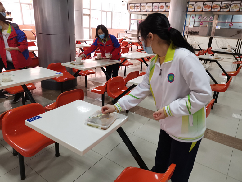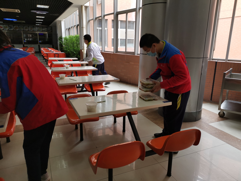4月21日中午就餐时段,在我校的学生餐厅和体育馆中,高二1班、高一25班的同学们在不停地忙碌着,他们便是今天值日的“食堂小帮厨”。只见“小帮厨”佩戴口罩、戴上手套、经过消毒后进入餐厅,快速地把餐厅后厨准备好的饭菜、筷子逐一摆放在学生餐桌上。学生进入餐厅后无需排队端饭,直接对号入座用餐。每次“帮厨”,同学们都要在10分钟时间内,把2000多名学生的饭食端上餐桌。