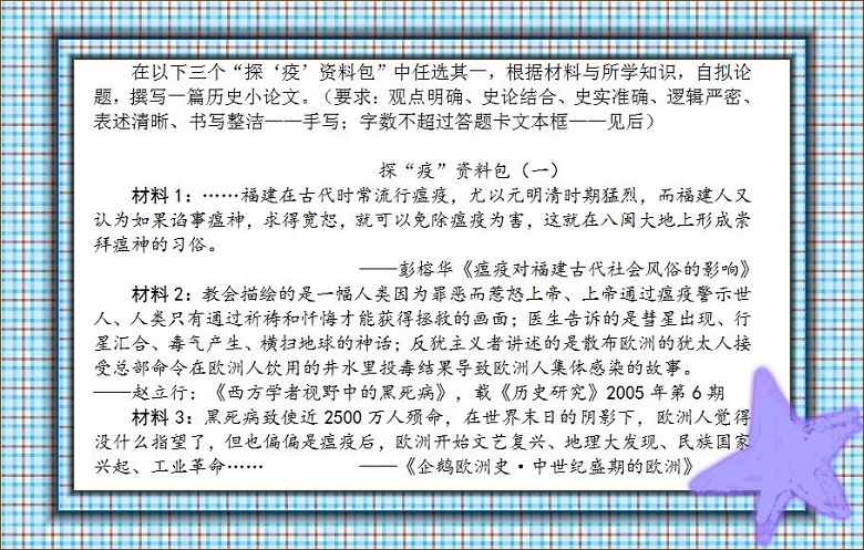 为了从浩瀚的历史长河中认识战“疫”,以期达到以史为鉴、面向未来,提升学科素养,坚定战“疫”信心的目的。经学校研究决定,历史学科组在高一、高二年级开展“以力战疫,以史探疫” 的学生活动,“战‘疫’进行中,探‘疫’无极限”。
