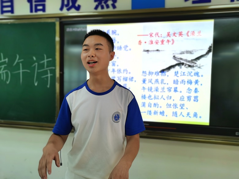 经过长时间的精心策划和准备,2020年6月19日班会时间,航空7班举行了迎端午诗词朗诵比赛。在班长郑牧琛和生活委员杨定康的主持下,全班30位同学全部参加。比赛开始前,主持人首先介绍了端午的由来,接下来同学们在精选的“唐·李商隐《缺题》” “唐代:殷尧藩《同州端午》”“唐代:尧藩《端午日》”“宋代:赵蕃《端午》”“宋代:王镃《重午》 ”“宋代: 朱淑真《端午》”“明代:汤显祖《午日处州禁竞渡》”等33首古诗词选一首朗诵,比赛过程中还邀请语文老师邱海宁、英语老师张娇和班主任秦才玉担任评委。朗诵比赛结束后,语文老师作了精彩点评,英语老师宣读了评比结果,班主任作班会总结。通过本次本次班会,同学们学习提高了朗诵和欣赏诗词水平,在唐诗宋词的氤氲书香中,感知中华传统节日端午节的魅力。