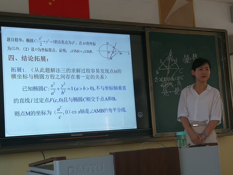 本次说题活动的主讲人为李晶老师,主题为“一道高考解析几何题的探究与反思”。李老师以2018年全国1卷第19题解析几何题为引例,分五部分介绍了选题意图,题目各种解法探究,解题后的教学反思,题目结论的拓展,以及拓展性质的应用举例。在解法探究环节,李老师分别从代数视角和几何视角给出题目的不同解答,展示解析法和几何法在处理解析几何问题中的灵活应用。对于该题的结论,李老师从特殊到一般,从椭圆到抛物线再到双曲线,给出了五个拓展性质结论,并结合五道高考真题说明这些性质的应用,充分体现了高考试题“常考常新,推陈出新”,却又“似曾相识”。