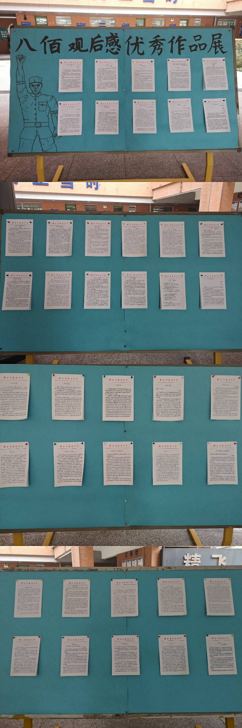 本次观影活动中学生精神备受洗礼,深有感触。返校后同学们积极书写观后感,提交语文老师指导修改。各班组织交流分享,并评选出优秀观后感进行集中展出。9月14日,《八佰》观后感优秀作品展在航校一楼展出,引来学生展开跨班级、跨年级的观摩学习,本次爱国主义教育效果进一步深化。