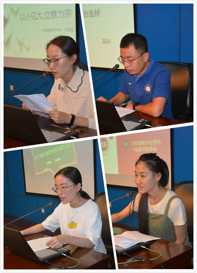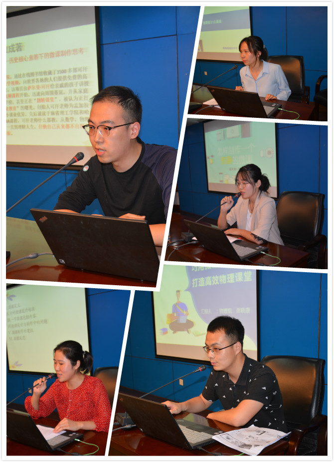随后,我校获奖的九位青年教师——原雪、高洁、王博、谢晓康、苟丽丽、李金、田子琳、高山、邢莹莹以自己丰富的经验,结合大量的案例,从微课的定义、微课选题、微课教学设计、内容导入、教学目标公布、教师讲解、微课拍摄及注意事项等方面进行介绍。他们的观点新颖、逻辑紧密、表达富有感染力,讲解内容引人入胜,与会老师深受启发。