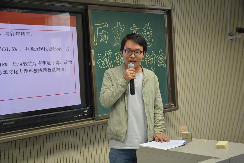 首先,我校左鑫老师以多维度的试题量化分析数据为依托,从总体介绍和考察重点总说切入,并对2020年高考全国二卷试题逐一进行了剖析。经由左鑫老师分析,高考历史试题不仅有清晰明确的知识主干,还有蔓延的核心素养与必备能力的枝桠,更有前后贯穿的生长动线。其中,史学理论部分重出江湖为代表的新高考与旧教材的结合、国史党史持续增加比重体现的价值引领都是需要持续关注的重点。