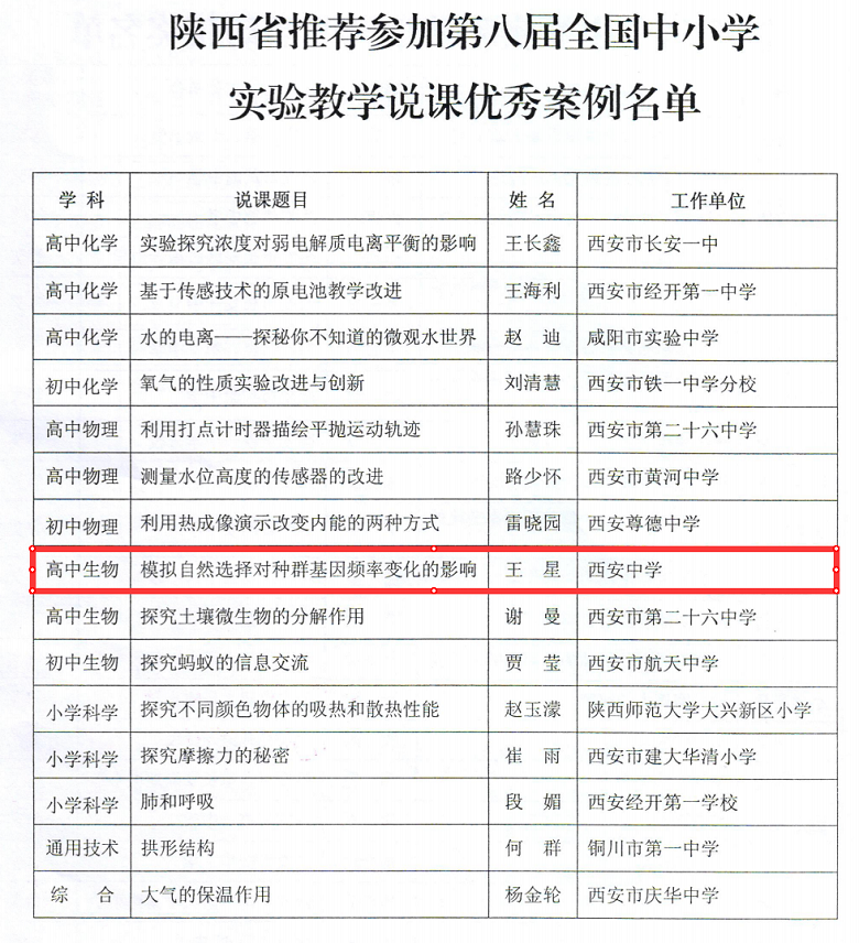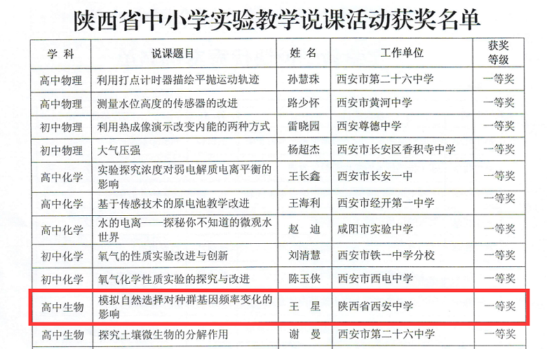 在2020年陕西省中小学实验教学说课活动中,我校生物教师王星获一等奖,并被推荐参加第八届全国中小学实验教学说课活动。