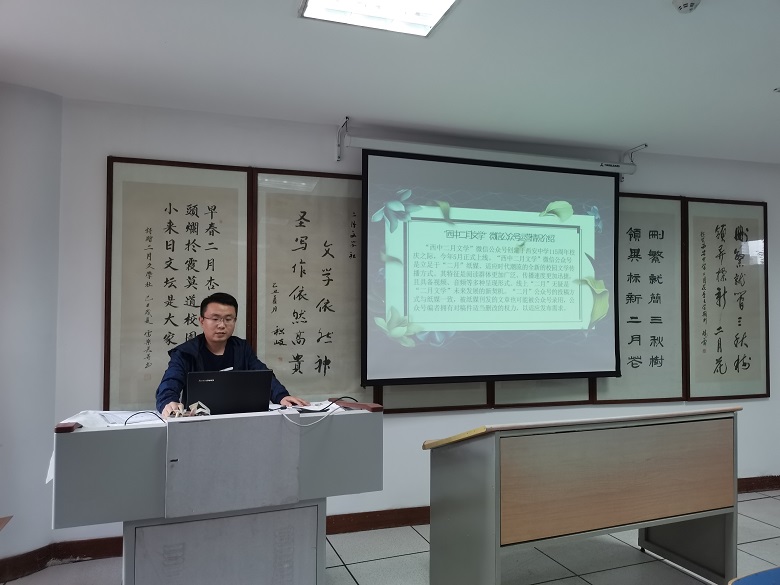 屈锋老师向同学们介绍了“西中二月文学”公众号的运作情况。他从新媒体阅读群体更加广泛、传播速度更加迅捷,且具备视频、音频等多种呈现形式的特征谈起,并认为“西中二月文学”微信公众号是立足于“二月”纸媒、适应时代潮流的全新的校园文学传播方式。