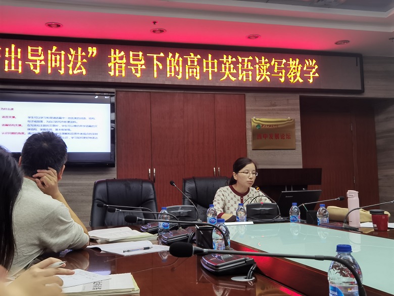 9月29日上午,高一及高二英语组全体教师在西一楼会议室共同聆听由景晶老师精心准备的“产出导向法指导写的高中读写教学”专题讲座。本次讲座由四个部分组成:新课标对高中英语写作技能的具体要求,高中英语写作教学理论及模式概览,产出导向法的理论体系以及产出导向法指导下的高中英语读写教学实践。产出导向法(The Production-oriented Approach)由北京外国语大学中国外语与教育研究中心文秋芳教授为首的研究团队创建的符合中国国情的外语教学理论,注重输入性语言学习和产出性语言运用之间的紧密联系,指导学生在对输入性语言材料进行选择性学习和加工的过程中主动积累写作知识,增强写作体验,实现学用结合,从而培养学生的英语学科核心素养。景老师就目前国内外的研究文献进行了细致地整理,分析“读”与“写”之间的关系,重点介绍了产出导向法的体系发展历程,教学理念,教学假设,紧扣教学中的驱动,促成以及评价三大环节,并结合自身教学体验呈现了产出导向法在日常读写课型中的应用实践案例。