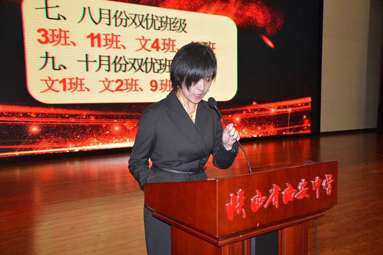 随后,由学生代表淡泓臻、史文茜同学送来了激情昂扬的演讲。会议的最后,由宋心茹副主任宣读了在本次月考中取得优异成绩的学生名单,并为他们颁奖。