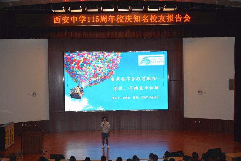 10月16号下午,陕西省西安中学艺术报告厅隆重举行了我校115周年校庆系列活动之知名校友报告会。高2010届知名校友潘驿炜、程晗回到阔别10年的母校,为高2023届的学弟学妹们做了一场精彩报告,他们用自己的人生经历、工作阅历和专业特长,为同学们的人生目标、生涯规划、高中生活提供了借鉴和指导,使同学们受益颇多。我校高一部分班级参加此次报告会,报告会由校长助理何海林主持。