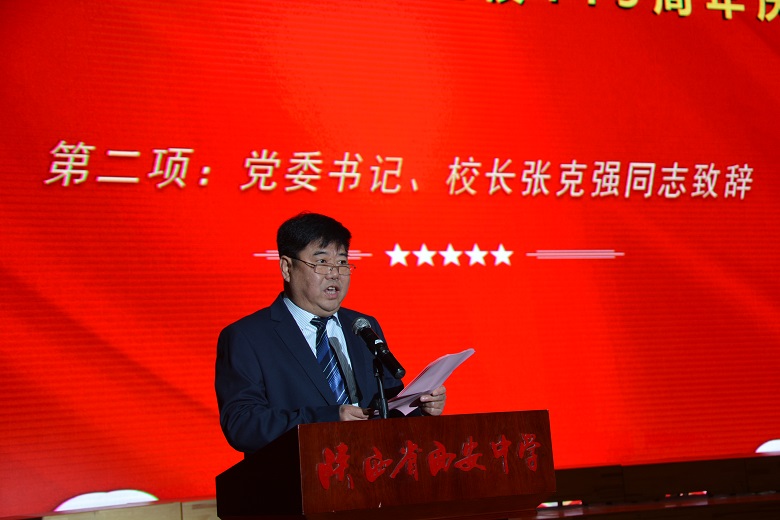 第二项,我校党委书记、校长张克强同志致辞。张校长代表学校领导班子,向全校师生表示诚挚慰问和热烈祝贺,并向离退休教师表达了最衷心的感谢。张校长的讲话回溯了建校115年来,一代代西中人弦歌不断、育人不辍的教育征途,介绍了西中近年来围绕立德树人根本任务,积极探索多样化、特色化的办学之路,在集团化办学、国防教育、民族教育、国际教育等方面都取得的显著成绩。激励全体教职工凝心聚力,不忘初心,努力推动学校内涵发展。勉励全体同学做有家国情怀,有理想信念的德智体美劳全面发展人,做担当民族复兴大任的时代新人。