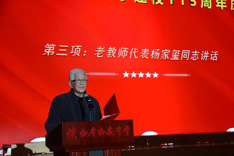 第三项,老教师代表杨家玺同志讲话。他以“记忆、见证、未来”作为关键词表达了离退休老同志对学校的感情与感受,老领导高度肯定了西中近五年来的迅速发展,并对西中未来发展表达殷切期望和美好祝愿。