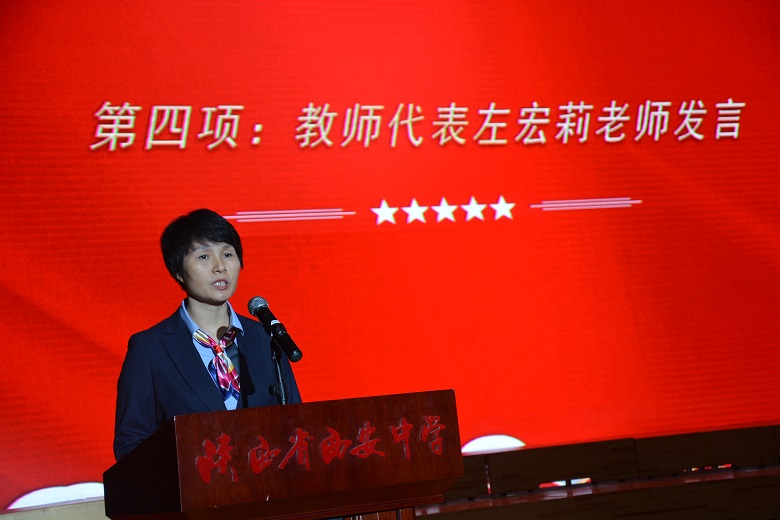 第四项,教师代表左宏莉讲话。左老师代表全体教师为学校送上生日祝福,同时表达了作为西中发展见证者、亲历者与参与者的自豪与欣喜;向教育前辈们致以崇高的敬意;表达了西中教师崇德敬业、锐意进取的决心。