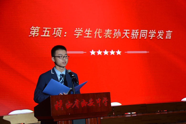 第五项,学生代表孙天骄同学发言。他以深情的语调表达对学校的祝福、对师长的感激,以铿锵激昂的言语抒发西中学子的荣光,以最诚挚的祝愿勉励同学积极进取,早日成为国之栋梁。