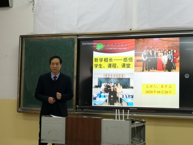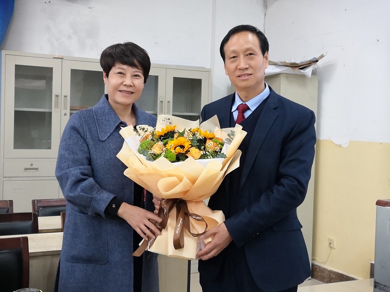 最后秦老师与大家分享了他在教学过程中为学生创作的各种高考寄语。马文哲老师作为年轻教师代表表达了自己对秦老师的感谢,崔文瑜老师作为全体教师代表为秦老师献上了鲜花。