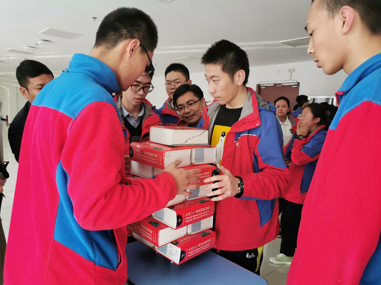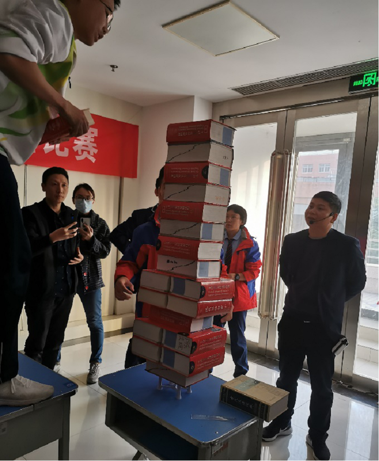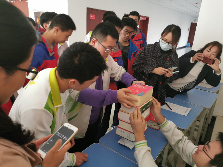 下午4点20分,全体工作人员及各班参赛选手陆续到场签到抽签。在胡晓洲老师宣布比赛要求后,“纸桥承重比赛”正式拉开了帷幕。比赛要求学生在自己所设计的纸桥上不断累积汉英大辞典,直到不能累积且坚持一分钟为止,积累的字典数目为最后的承重成绩。