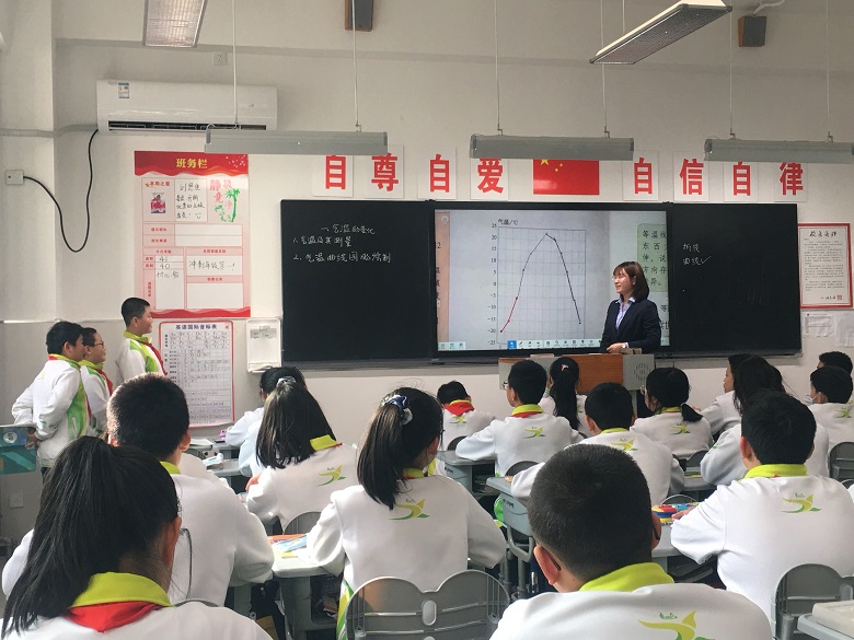 本次活动分两个环节,第一是课题听课,第二是评课与教研分析。首先在泾河一中初中七年级1班教室,曹润珊老师进行了一节《气温的变化》的公开课。内容选自人教版七年级上册第三章《天气与气候》。本节课程教学内容的设计逻辑清晰、结构完整,突出了“正确判断气温日变化和年变化”“掌握气温曲线图画法”的重点,突破了“运用气温曲线图理解气温日变化和年变化”“掌握气温变化规律”的难点。教学设计侧重引导学生关注生活现象,教学手段充分利用了先进的现代技术设备,教学过程体现了学生为主体,教学评价增加了学生互评的方式,落实了“学习公民必备地理素养”的理念。