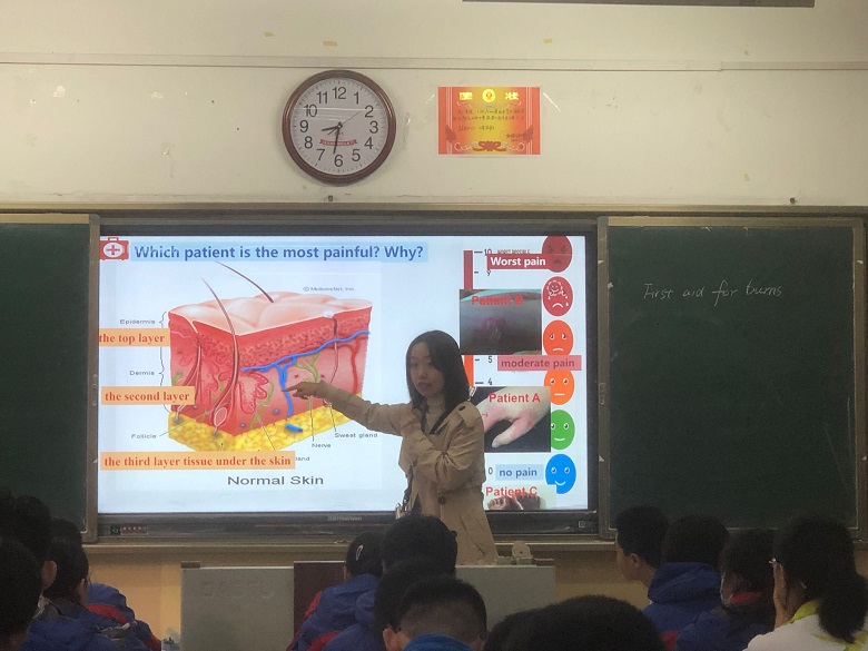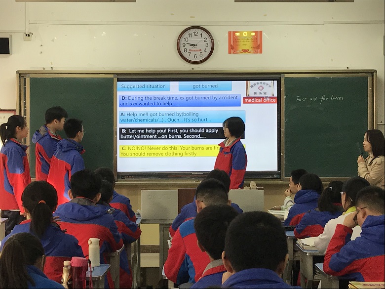 10月27日上午,英语学科组高一高二全体教师齐聚高二17班听取了杨雪逸老师《Unit 5 First Aids》第一课时warming up and reading。公开课上,杨老师用急救的一句定义音频和几个急救小视频导入话题,既生动有趣画面感感代入感强,又完成了词汇铺垫,使学生对本单元重点词汇有了初步的认识;紧接着,进入课文阅读环节,杨老师对上次教研活动景晶老师分享的产出导向法进行了一次小尝试,给学生先创设了一个烧伤的话题情景,让学生带着如何应对烧伤的问题进行课文阅读。通过读前预测、略读、细读、读后演绎四个步骤,设计了多元化的任务,让学生既对急救有了整体性的认识,又对烧伤的应对措施及原理有了清晰细致的理解。本节课的最后,通过让学生进行烧伤情景角色扮演,检验了学生对于阅读文章的理解掌握情况。整堂课,杨老师指令清晰,启发学生认真思考,师生配合默契,成功完成了一堂形式新颖的传统阅读课。