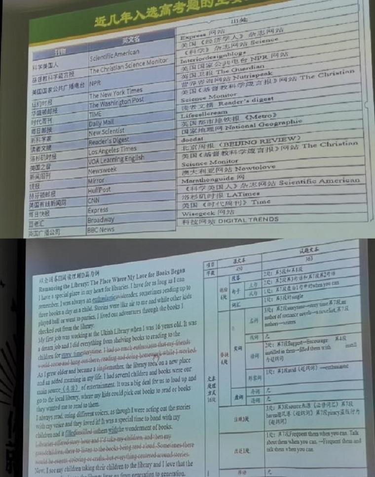 其次,在高考阅读材料出处分析部分,周老师提出,为了高效备考、精准备考,高三教师可从近五年真题文章来源、考题与原文对比两个角度入手,对高考真题进行深入、细致钻研的同时,多多关注诸如《经济学人》、《纽约时报》、《华盛顿邮报》、美国之音等杂志、报刊、电台等文章,选择适当的文章进行改编,将题目加入到高三平时的周练考中。
