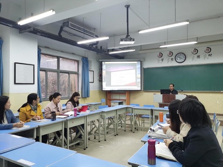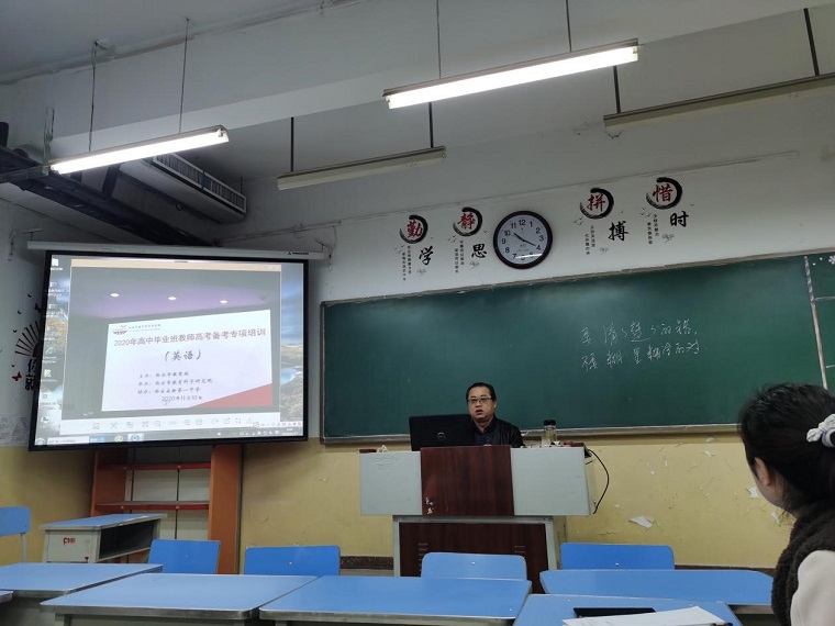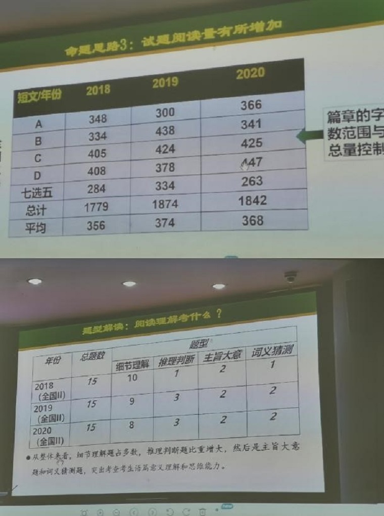 结合参加培训的收获,周老师就“历年高考命题分析”、“高考阅读材料出处分析”、“一轮复习备考方式方法”三个方面展开,对我校高2021届英语高考复习备考进行指导。