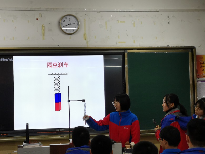 新课开始之前,徐老师先给学生现场演示了用电磁炉煎鸡蛋的过程,并提出问题“电磁炉怎样煎熟鸡蛋”,成功引起了学生的兴趣。接着通过演示“隔空刹车”、“自动小火车”两个趣味实验带领学生们认识了电磁阻尼和电磁驱动现象。在课上,徐老师利用电磁炉加热食物的过程让学生感知涡流的存在,邀请多名学生尝试用不同材质的圆环使上下振动的磁铁停止运动,现场演示了电池小车在铜线轨道中自动运行的实验,增强了物理课堂的趣味性,体现了“物理源于生活,高于生活”的学科理念,整节课上师生配合默契,学生积极思考,初步达到了预期的目标。