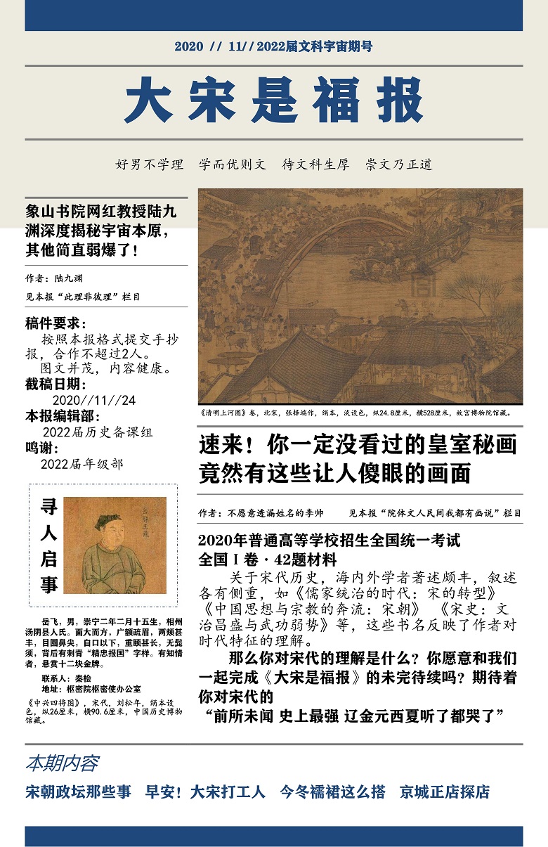 读史可以明智,知古方能鉴今。为激发学生们对历史热爱,感受中华传统文化的魅力,传承中华文明,历史组面向高二年级文科班开展了“大宋是福报”手抄报主题活动。