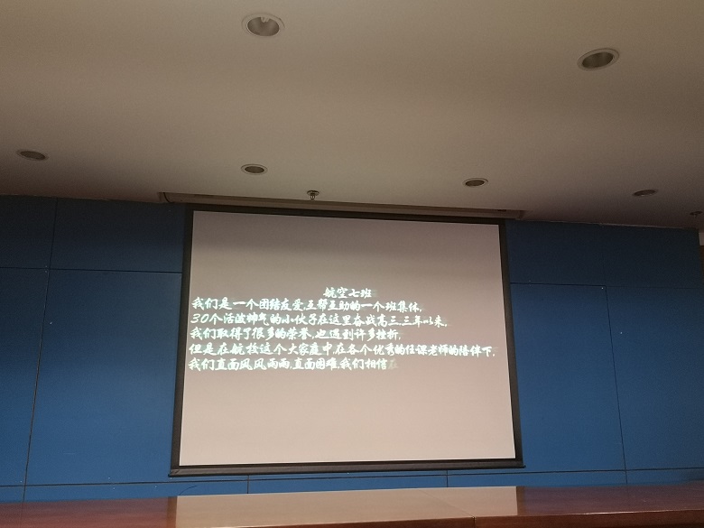 首先亮相的航空9班,开场介绍沉着稳重,班级口号自信响亮,视频画面在舒缓的音乐声中徐徐铺展,两年来的航校生活娓娓道来,同一位置的两张班级合影令人动容,成长的印记清晰可见。航空7班、8班的作品内容丰富,演出自然,充分展示了作为高三学长的自信、从容、成熟、自省,纵使高考多困苦,少年壮志可拿云。航空10班的作品重在突出班级“那股拼搏的劲儿”,开场轻快活泼,结尾深挚感人。最后登场的是航空11班,“小小少年,大大志向”,以大气的画面细腻呈现了“初来者”的满心好奇与惊喜。五个班级,五次班级介绍,五次微视频播放,各具匠心、各显才情,现场掌声雷动,学生们欢呼沸腾。