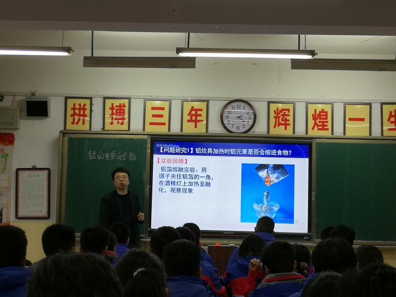 化学组王丹老师以《铝的重要化合物》为题在高一双8班进行了授课,王老师从讨论铝元素对人体健康是否有影响导入新课,通过对生活中可能摄入铝元素的方式进行了探究,以“关爱健康之旅的三站——厨房、药房和早餐”为主线,用实验探究了本节课的重点内容:氧化铝的性质、氢氧化铝的性质及制备和用途。本节课学生活动较丰富,有学生分组实验,分组讨论等,且实验设计简单,操作性强。王老师思维严谨,条理清晰,步步推进,注重学生思维的引领,让学生学会了在实验中思考问题,探究问题,最终解决问题。