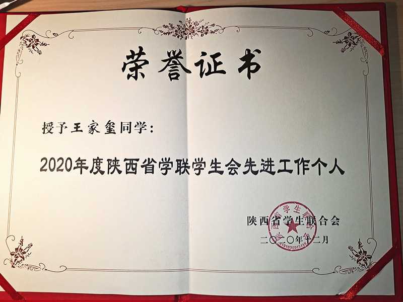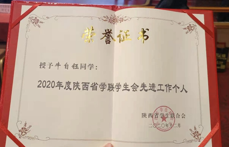 接着,大会对2020年度陕西省标兵学联学生会组织和2020年度陕西省学联学生会工作先进个人进行了表彰。我校学生会被评为2020年度陕西省标兵学联学生会组织,学生会主席牛自钰、王家玺荣获陕西省学联学生会先进个人。