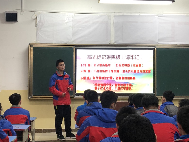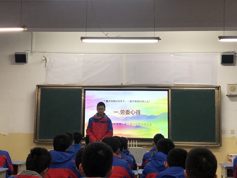 会议开始,敖主任以“营造良好的班级环境”作为导入,强调了干净整洁的教室对班级风貌的重要性。 在第一环节中,郭宇航同学由“一屋不扫,何以扫天下”引入话题,将自己多年担任劳委的劳动心得娓娓道来。 “没有规矩,不成方圆”,郭宇航同学又以高二18班的值日制度为例,分别介绍了劳动时间安排以及奖惩制度。