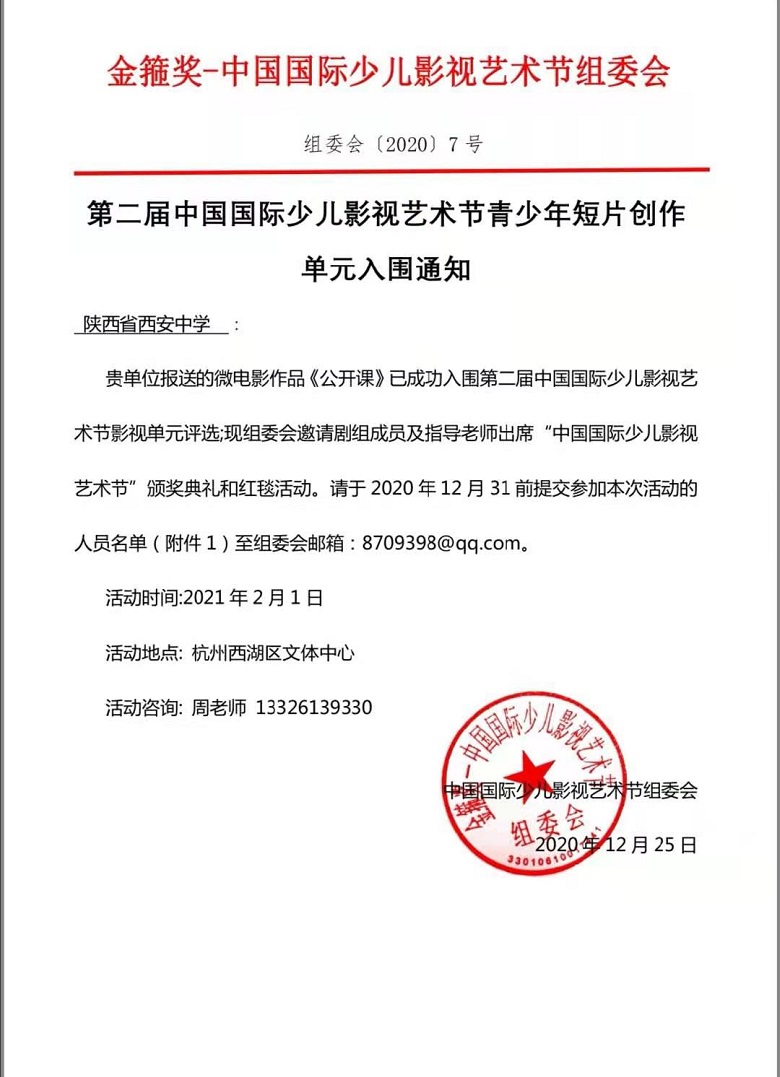 2020年12月传来喜讯,我校微电影《公开课》入围第二届中国国际少儿艺术节青少年短片的单元,剧组成员与主创老师获邀参加颁奖典礼,西中将再次闪耀在红毯之上。