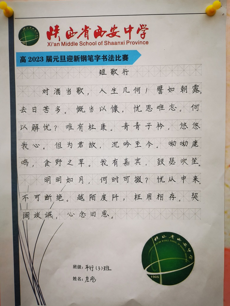 元旦来临之际,我校高2023届语文组在年级部的大力支持下,开展了以“徽墨迎新蕊,翰藻吐芬芳”为主题的硬笔书法活动,全员参与,择优展出。年级部和语文组老师希望同学们能够借此活动,沉下心来认识到汉字之美,也祝福所有的同学和老师,愿大家在新的一年里,每一次挥毫书写之时,都能感受到书法的美并努力追求书写艺术的更高境界。