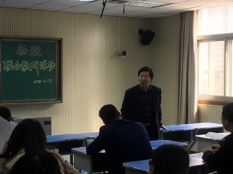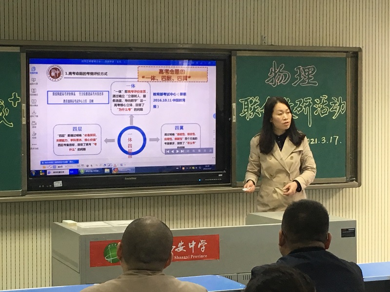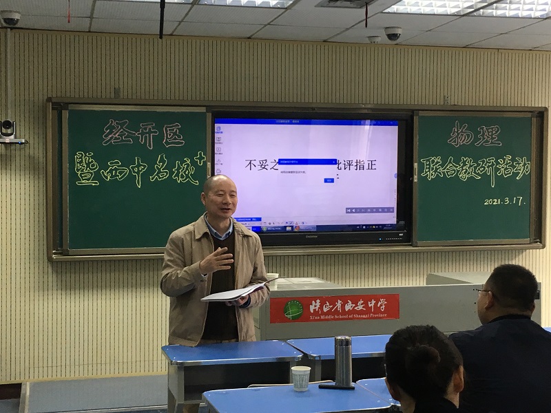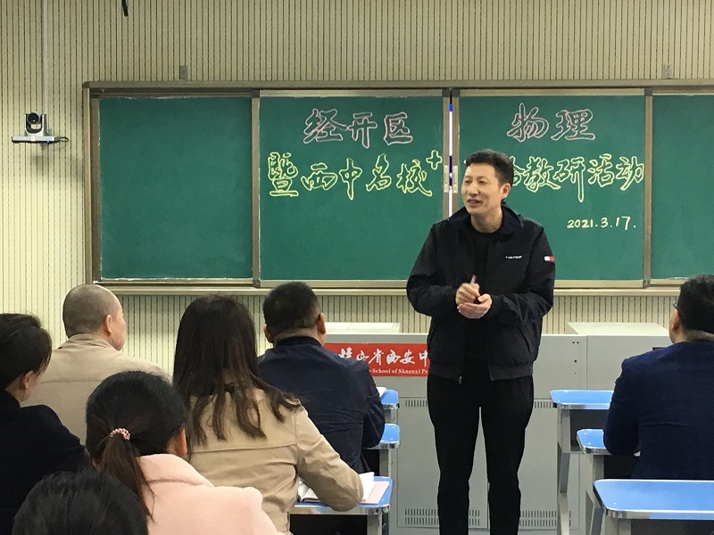 为准确把握2021年高考动向,合理安排高考复习,制定科学高效的二轮、三轮备考方案,3月17日我校物理组承办了经开区暨西中名校+物理联合教研活动。西安中学、经开一中、经开二中、经开三中、泾河一中等学校的全体物理教师于西安中学主会场和各校分会场参与了此次活动。活动由我校物理学科组组长蒲强老师主持,我校教科研室樊兰君副主任做了主题报告。
