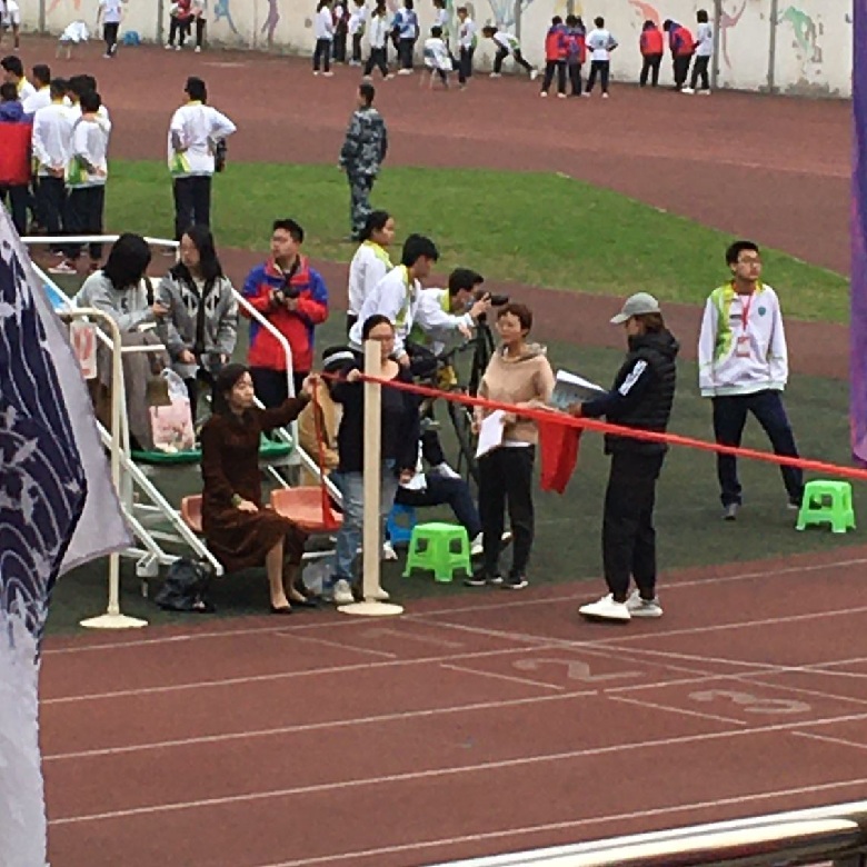 志愿抻线的老师——一位很亲和的老师坐在赛道旁,一直忙着抻红色终点线。在被问及志愿服务的感受时,她说:“很乐意,很羡慕你们的青春,每个人都拥有过青春,一定要好好珍惜。”她就是高一年级部的孟泽老师,像这样热情洋溢而又默默无闻忙碌在场地的老师还有许多。