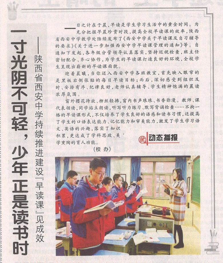 2021年3月26日,中国德育第一报《德育报》在头版报道了我校早读课开展情况,题目为《一寸光阴不可轻,少年正是读书时——陕西省西安中学持续推进建设“早读课”见成效》。