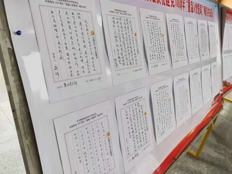 前期,校党委精心制定了活动方案,策划印制了书法纸。活动中,各支部组织有力,全体党员热情参与,通过重温入党誓词,进一步增强了责任感与使命感,坚定了教育初心,明确了职责使命,为正在开展的党史学习教育活动提供思想保证。(注:硬笔书法展板在行政楼大厅处)